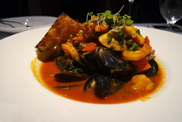 Emboldened by their delightful mussels we also ordered a Cioppino. A play on the hearty Italian stew, Mitchell Block's version takes a host of fresh seafood and infuses them into a saffron broth. The bounty from the sea includes shrimp, mussels, clams and pickerel whom are all perfectly cooked and incredibly tender. But it is the saffron broth with its hint of spiciness and deep tomato-ey flavour that makes this dish fly. And also make sure to dip the accompanied bread into the broth, now enhanced with the taste of all the seafood, at the end of your meal!